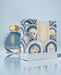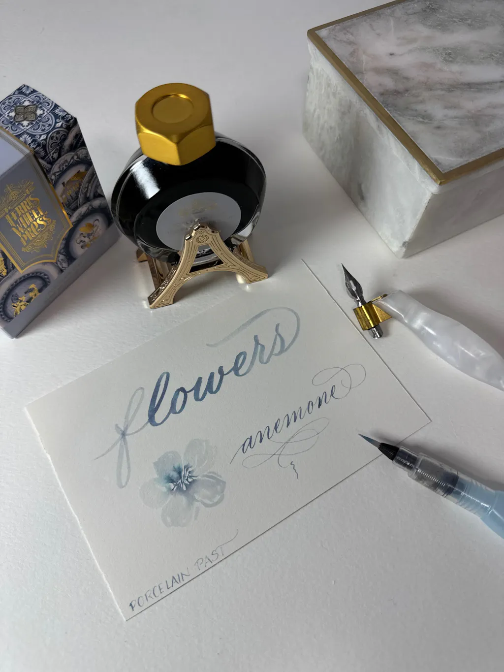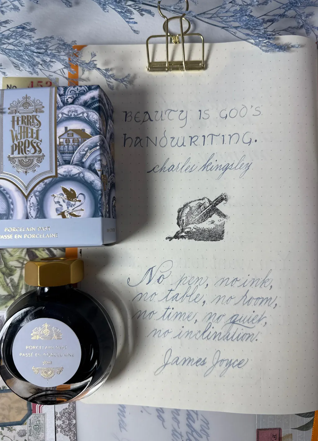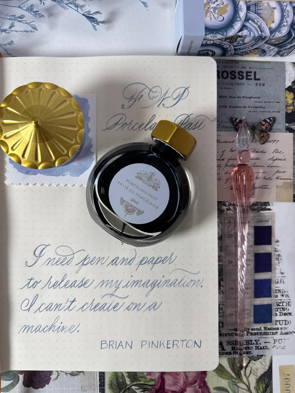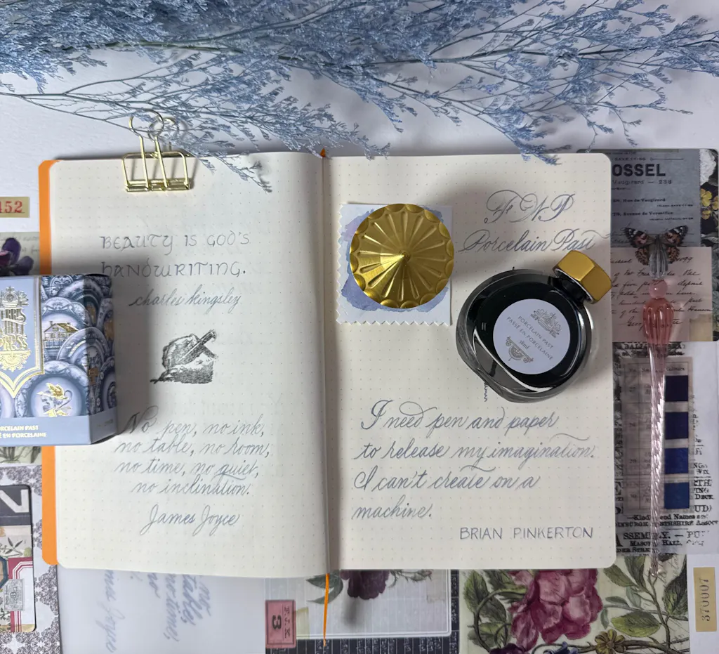 Dive into Madame Mulberry 's extraordinary compilation of fine dinnerware that captures the beauty of ornamental design through history. Moments relived through images painted on custom flatware, inspired by Racinet and privately commissioned by Madame Mulberry. Her collection of memories is represented through a serene blue ink, perfect for documenting your own thoughts, hopes and dreams.